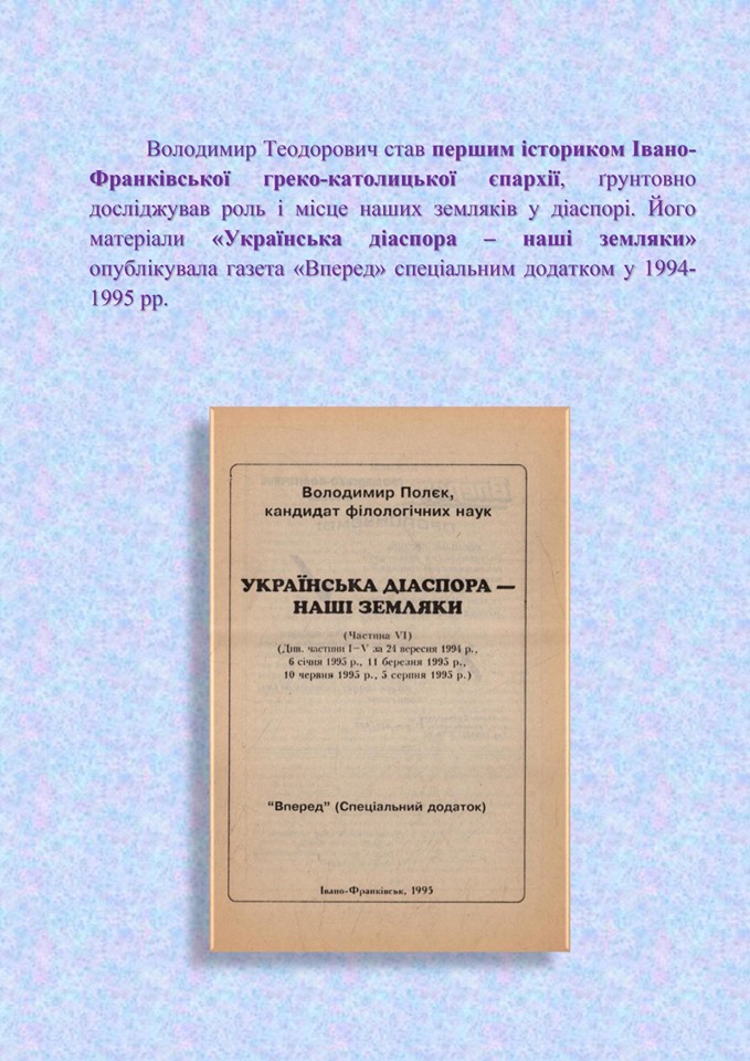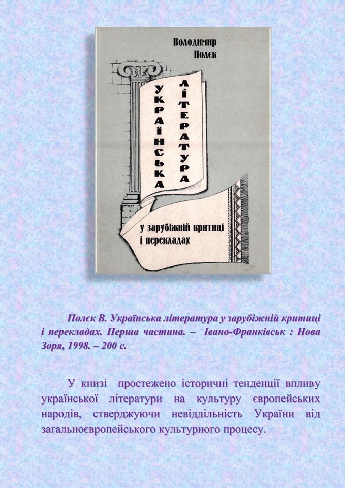 - 3.Володимир Теодорович Полєк (1924-1999): біобібліографічний покажчик (до 95-річчя від дня народження) / упоряд. О. М. Блинчук ; відп. ред. П. М. Гаврилишин ; наук. ред. О. Б. Гуцуляк. – Івано-Франківськ : Місто-НВ, 2019. – 72 с. – (Серія «Вчені Прикарпатського національного університету»). Переглянути (doc) >>>