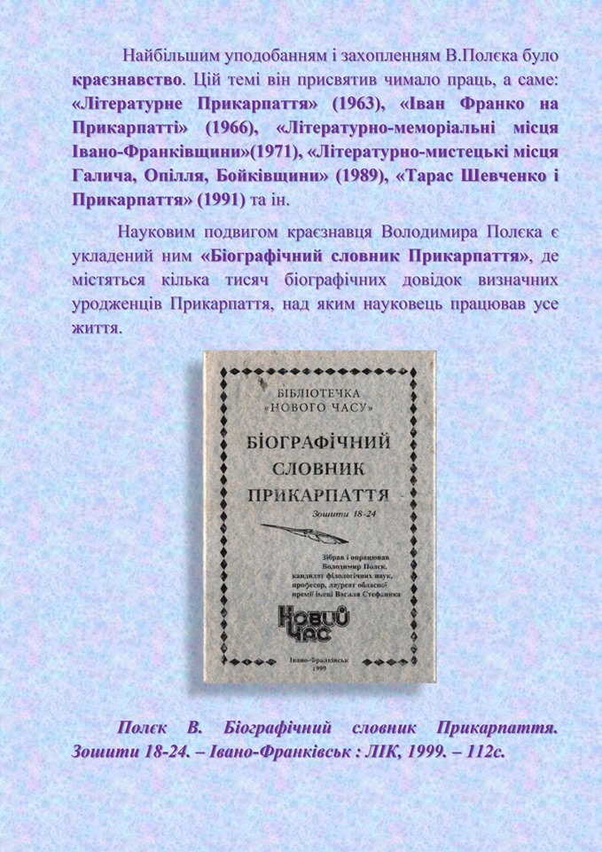 - 2.Біографічна довідка про Володимира Теодоровича Полєка // Краєзнавець Прикарпаття. – 2010. – № 15. – С. 8.