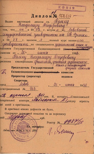 У 1952 р. поступив і 1958 року заочно закінчив філологічний факультет Львівського університету (спеціальність “Українська мова і література”).