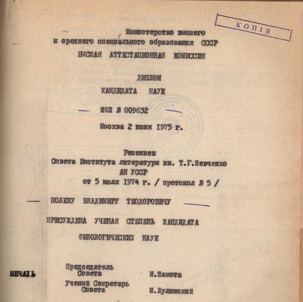 Захистив кандидатську дисертацію, присвячену рецепції творчості І. Котляревського у зарубіжній критиці (1974).